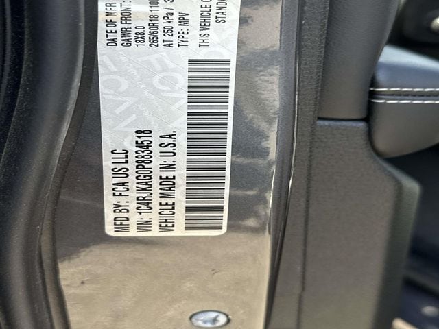 FCA US LLC Certified Pre-Owned Certified, FCA US LLC Certified Pre-Owned Certified, 3.45 Rear Axle Ratio, 3rd row seats: split-bench, 4-Wheel Disc Brakes, 6 Speakers, ABS brakes, Air Conditioning, Alloy wheels, Anti-whiplash front head restraints, Automatic temperature control, Brake assist, Bumpers: body-color, Cloth Seats, Compass, Cruise control, Delay-off headlights, Driver door bin, Driver vanity mirror, Dual front impact airbags, Dual front side impact airbags, Electronic Stability Control, Emergency communication system, Four wheel independent suspension, Front anti-roll bar, Front Bucket Seats, Front Center Armrest w/Storage, Front dual zone A/C, Front License Plate Bracket, Front reading lights, Fully automatic headlights, Heated door mirrors, Illuminated entry, Knee airbag, Low tire pressure warning, Manual Fold Seatbacks, Molded In Color Black/Gloss Black Roof Rails, Normal Duty Suspension, Occupant sensing airbag, Outside temperature display, Overhead airbag, Overhead console, Panic alarm, ParkView Rear Back-Up Camera, Passenger door bin, Passenger vanity mirror, Power door mirrors, Power driver seat, Power steering, Power windows, Quick Order Package 23A Laredo, Radio data system, Radio: Uconnect 5 w/8.4" Display, Rear air conditioning, Rear anti-roll bar, Rear reading lights, Rear window defroster, Rear window wiper, Reclining 3rd row seat, Remote keyless entry, Security system, Speed-Sensitive Wipers, Split folding rear seat, Spoiler, Steering wheel mounted audio controls, Tachometer, Telescoping steering wheel, Tilt steering wheel, Traction control, Trip computer, Variably intermittent wipers, Voltmeter, Wheels: 18" x 8.0" Fully Painted Aluminum.